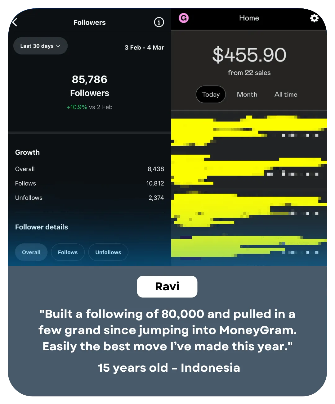 “Before MoneyGram, my account was stagnant at 3K followers. Four weeks in, I hit 18K and pulled in $1.5K in affiliate commissions—all thanks to their proven growth and monetization playbook.”